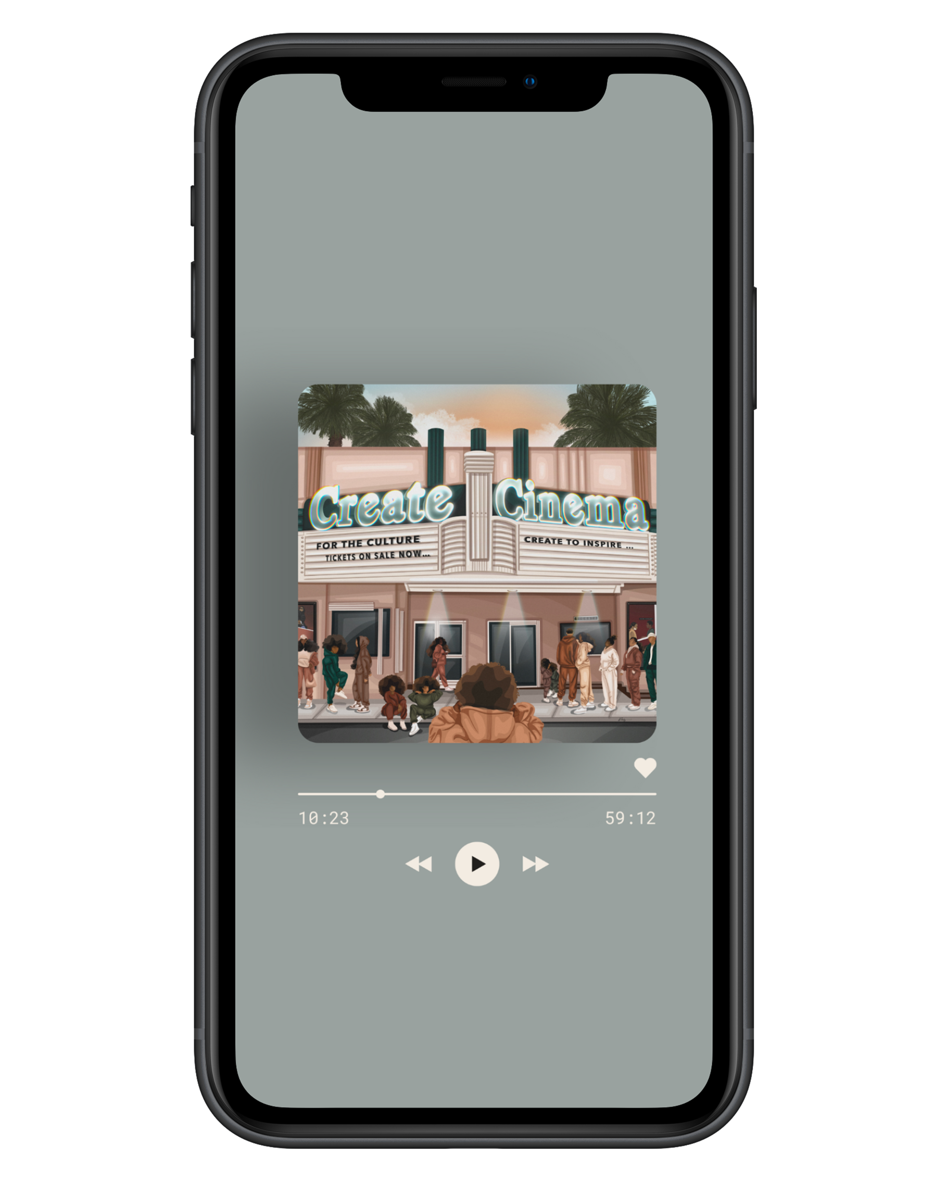 Illustrated cover art was developed for "Create Cinema", a conceptual podcast exploring movies and cinematic history. The design captures the power of film to connect communities, inspire dialogue, and create shared cultural experiences.