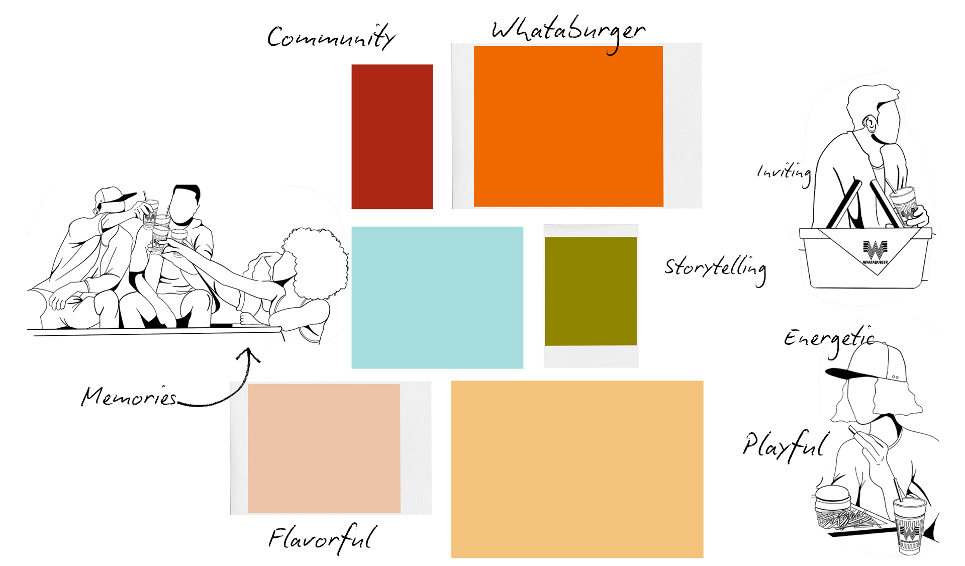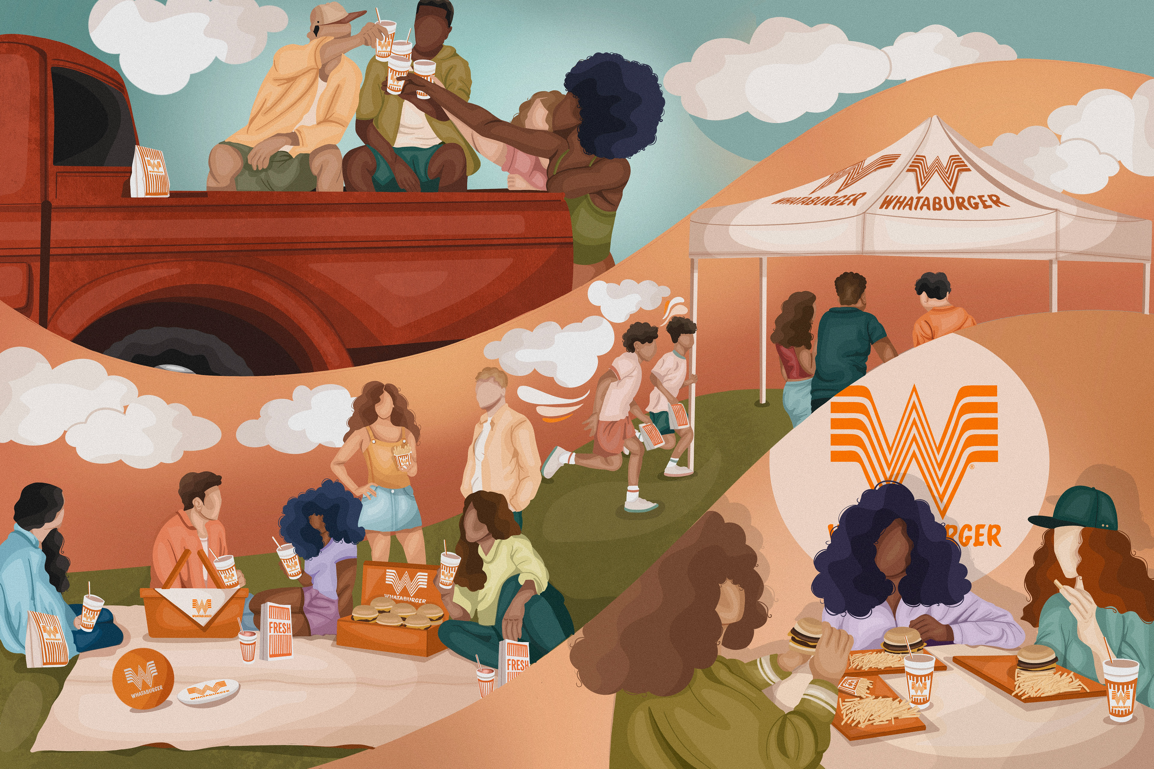 For SXSW, I was commissioned to create an illustration for the Whataburger Museum, a space dedicated to honoring the brand’s cultural impact. My piece highlighted the beauty of togetherness and the shared experiences that naturally unfold over Whataburger’s iconic food. Conceptually, the work drew from themes of memory, nostalgia, and community—universal touchpoints that aligned seamlessly with the brand’s identity while also resonating with festival-goers on a personal level.